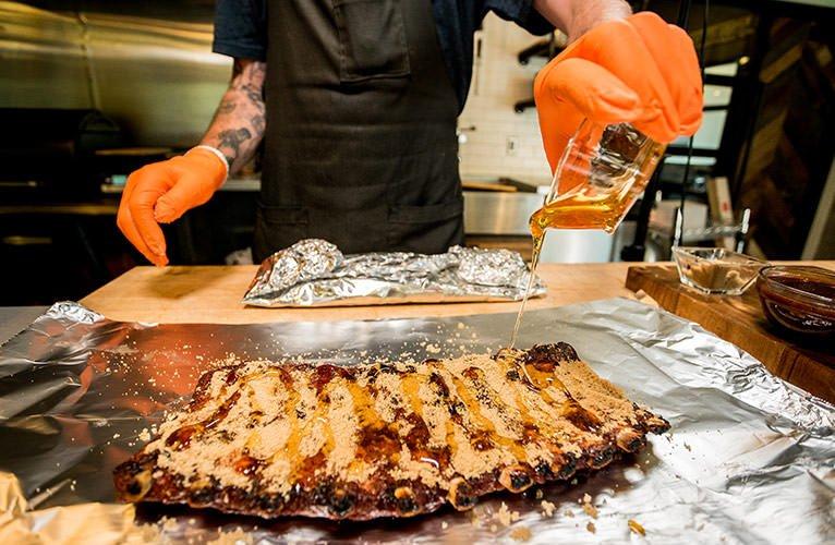 When judges look at your ribs, they’re looking for that deep mahogany finish. That thin, dark, caramelized BBQ coating is achieved by regular mopping, spritzing, or saucing ribs throughout the smoking process. But that’s not all -- judges are also looking for a uniform, perfectly rectangular rack that comes from those perfect knife cuts.